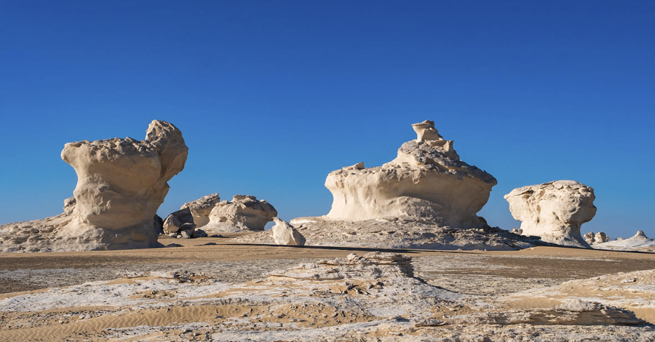 One of the most incredible and attractive aspects of the white desert is the existence of otherworldly landscapes featuring chalk-white rock formations that resemble mushrooms, columns, and other highly unique & intriguing shapes. The formation of the White Desert itself and all of its attractions can be primarily attributed to a number of natural factors which are: Over many millions of years, strong winds and sand storms through the region have eroded the soft, chalky rock formations that have sculpted them into their current distinctive and unique shapes. A number of researchers believe that erosion by powerful wind and sand patterns in the area has played the ultimate role in shaping the landscape. The Desert's unique white coloration comes from the heavy presence of sedimentary rock formations, primarily composed of calcium carbonate (calcite) and silica. The White Desert is home to various sand dunes which have buried portions of the chalk formations which has led to the creation of a natural artistic contrast between the white rock and the golden sand dunes which display a surreal visual effect. Over the century the area has experienced a noticeable geological activity causing the rocks to shift and crack which contributes to the unique rock formations