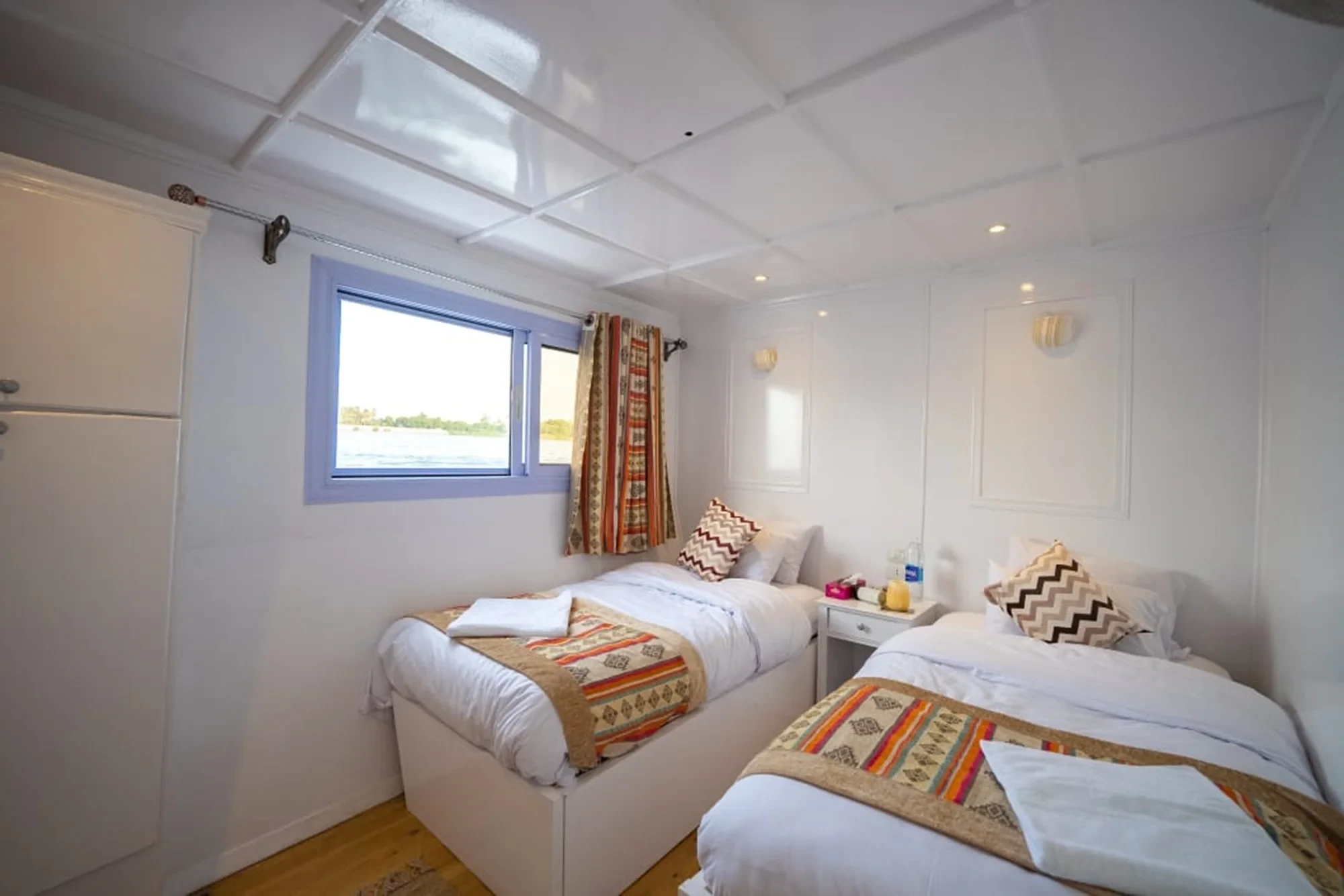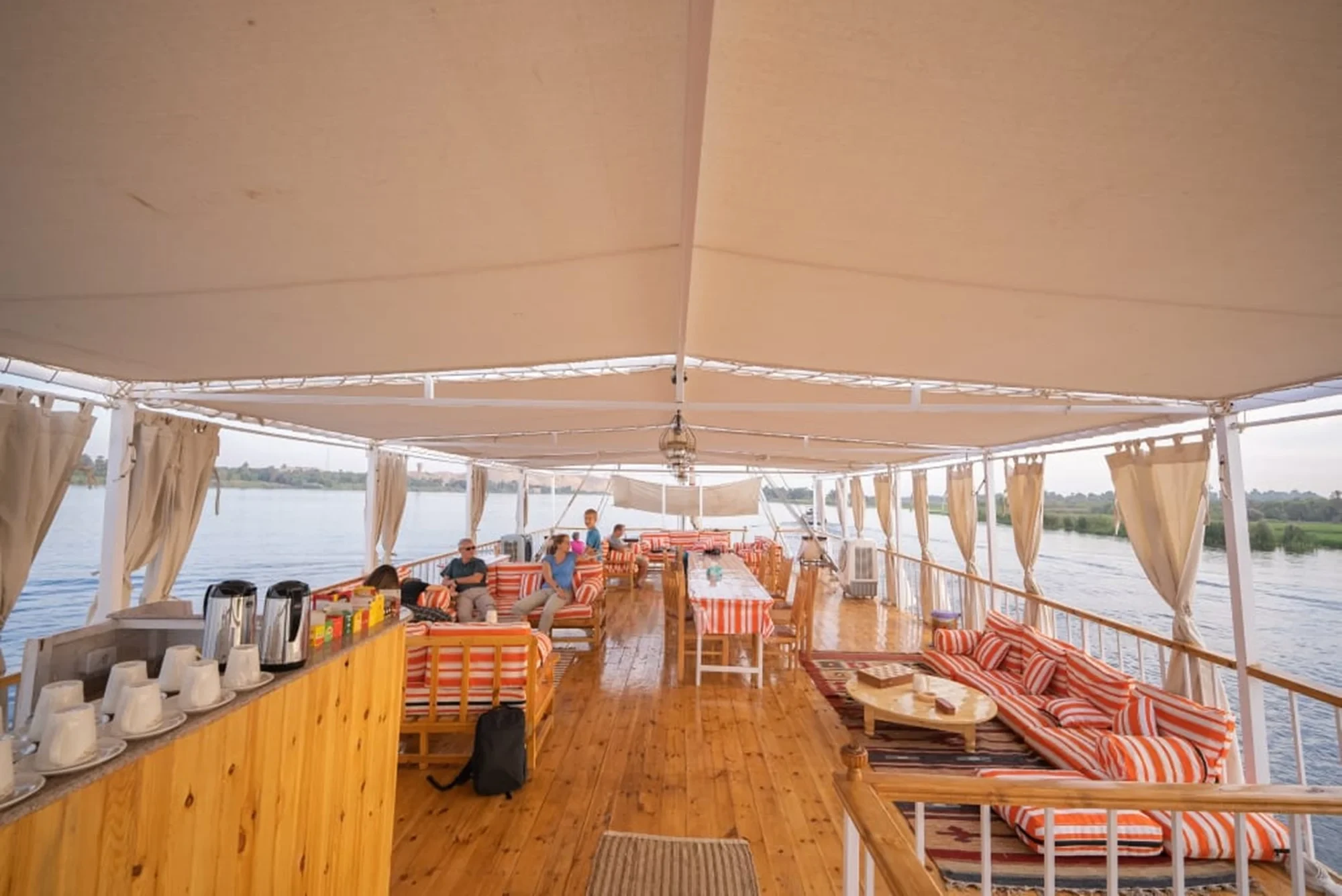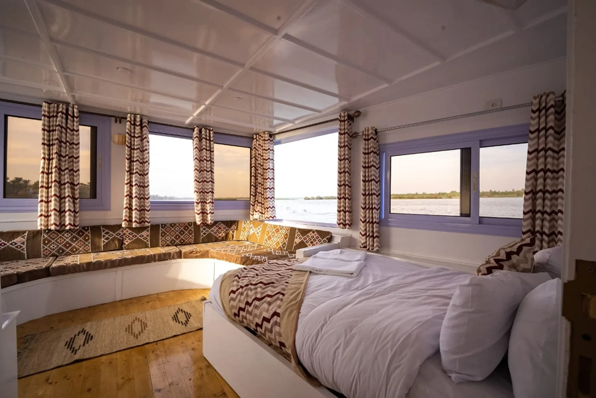 On board, relax and enjoy freshly prepared meals, peaceful views from the sun deck, and comfortable cabins with a touch of traditional Egyptian style.